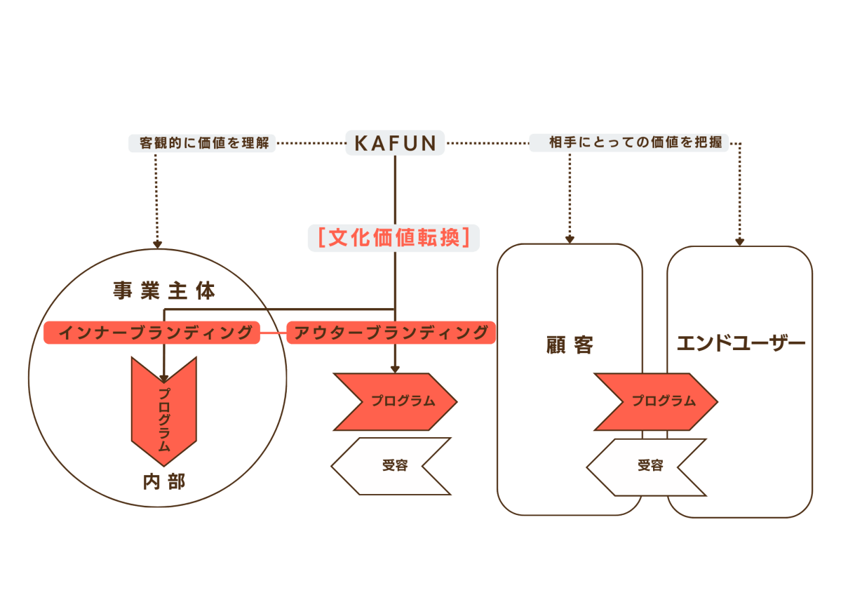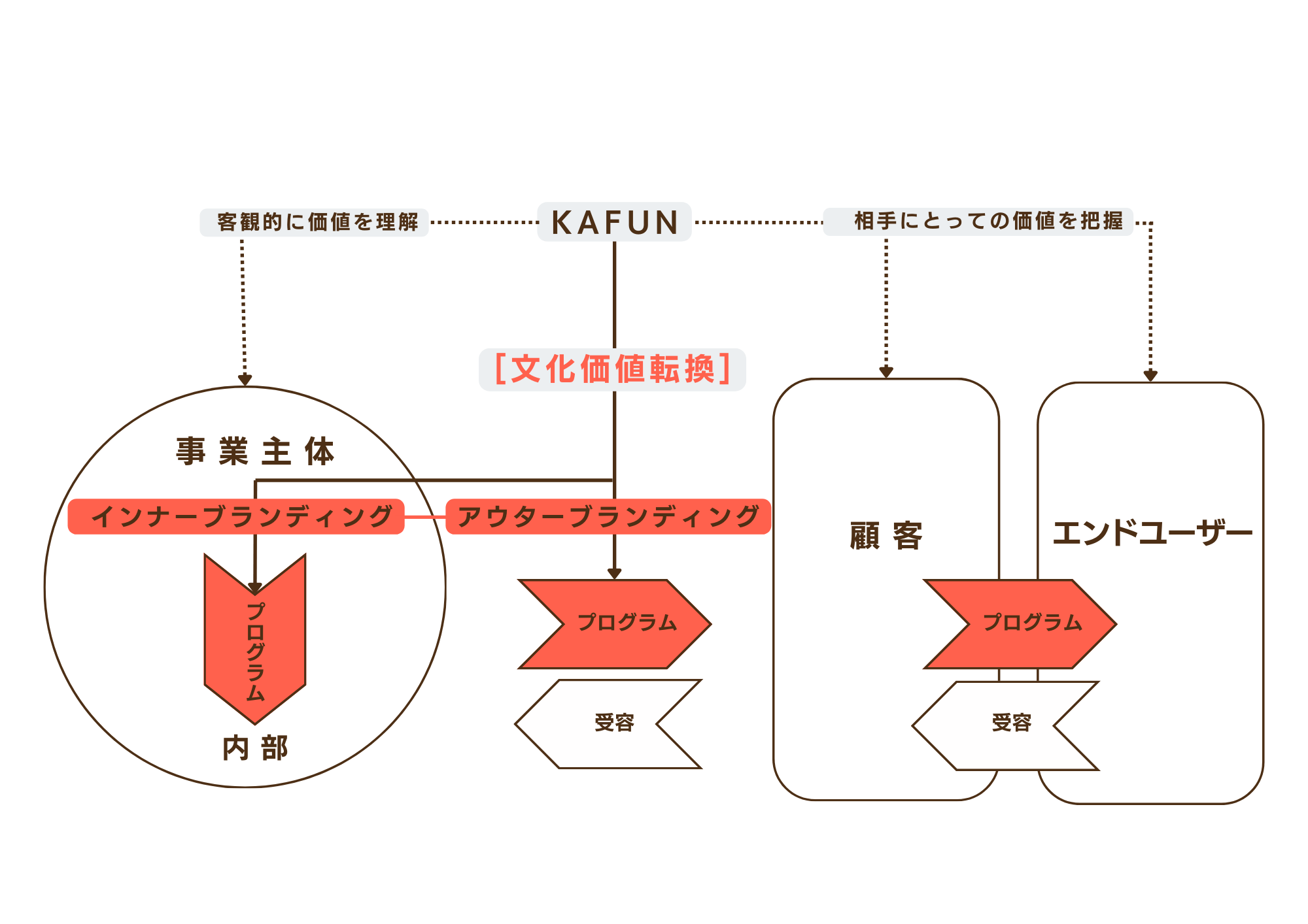 日本企業が海外で直面する課題は、商品力の不足ではありません。むしろ、優れた商品や企業文化を持ちながら、違う文化圏で受け入れられる価値を見出せていないこと主な要因です。KAFUNのカルチャーマーケティングは、企業・ブランドの備わる文化の本質を見出し、ターゲットとなる市場の文化的コンテクストに合わせて戦略的に価値転換します。その上で「伝わる言語とビジュアル」に落とし込むシステムを作ります。これにより、押し付けではない価値を受け入れられるブランド構築を実現します。